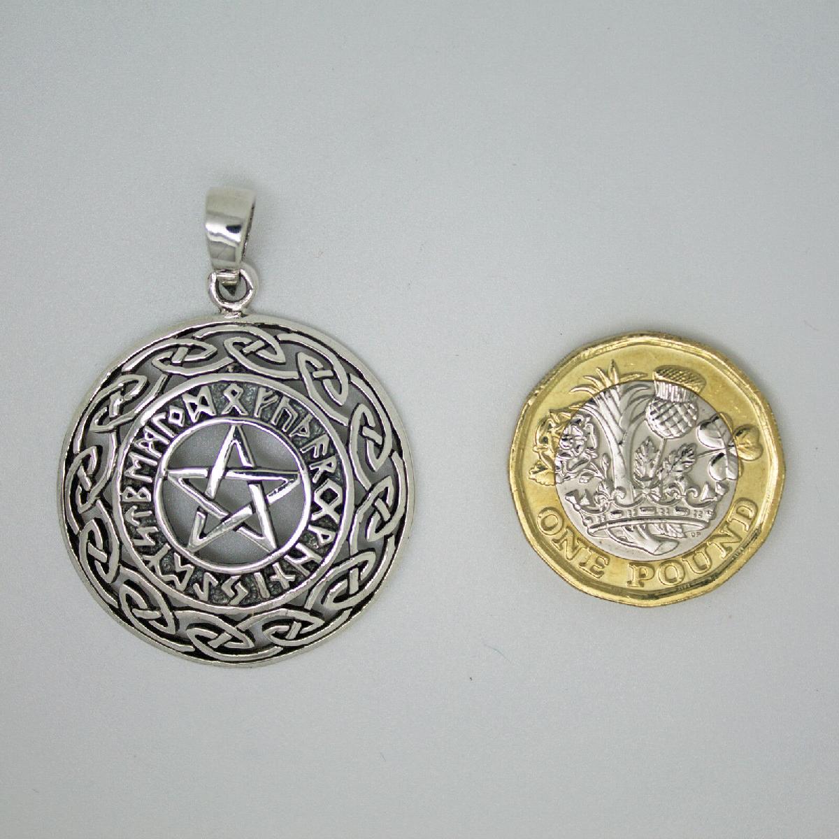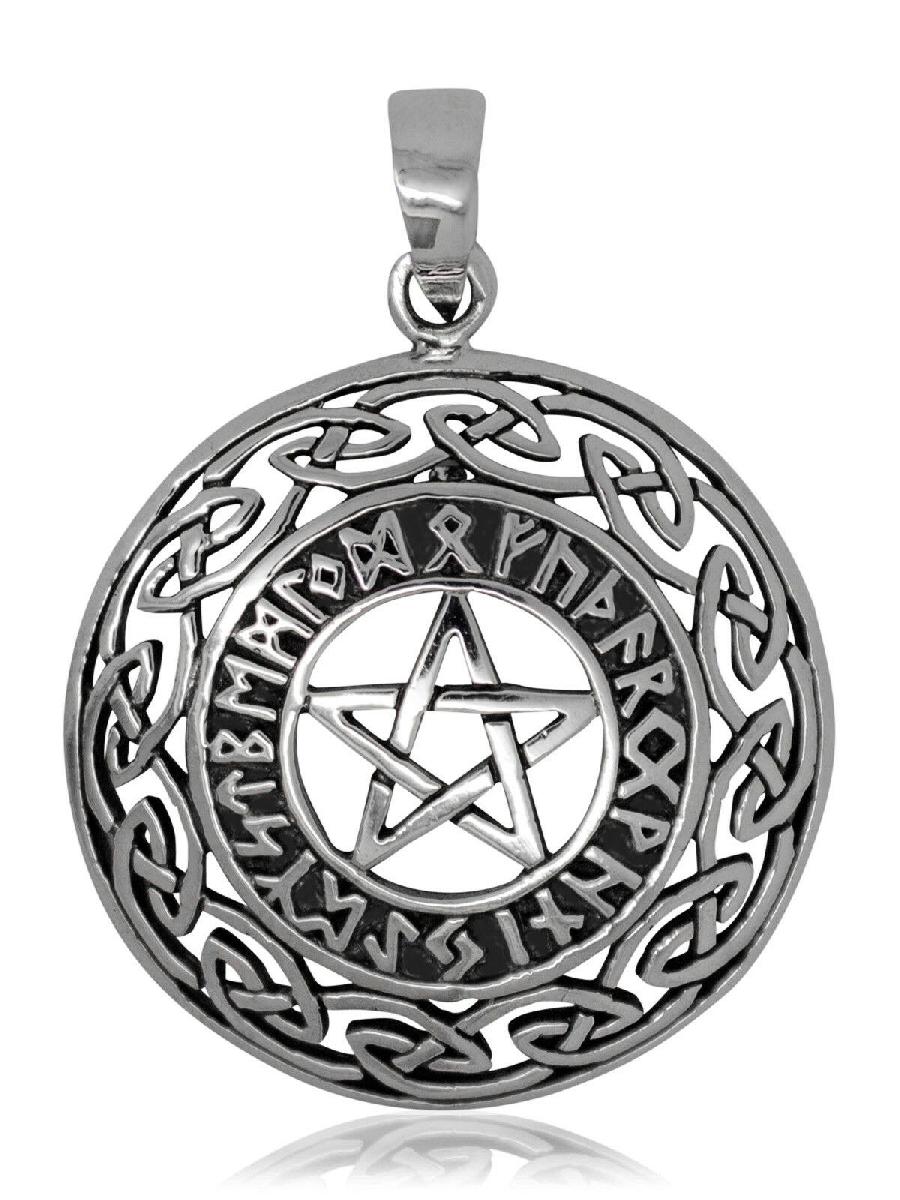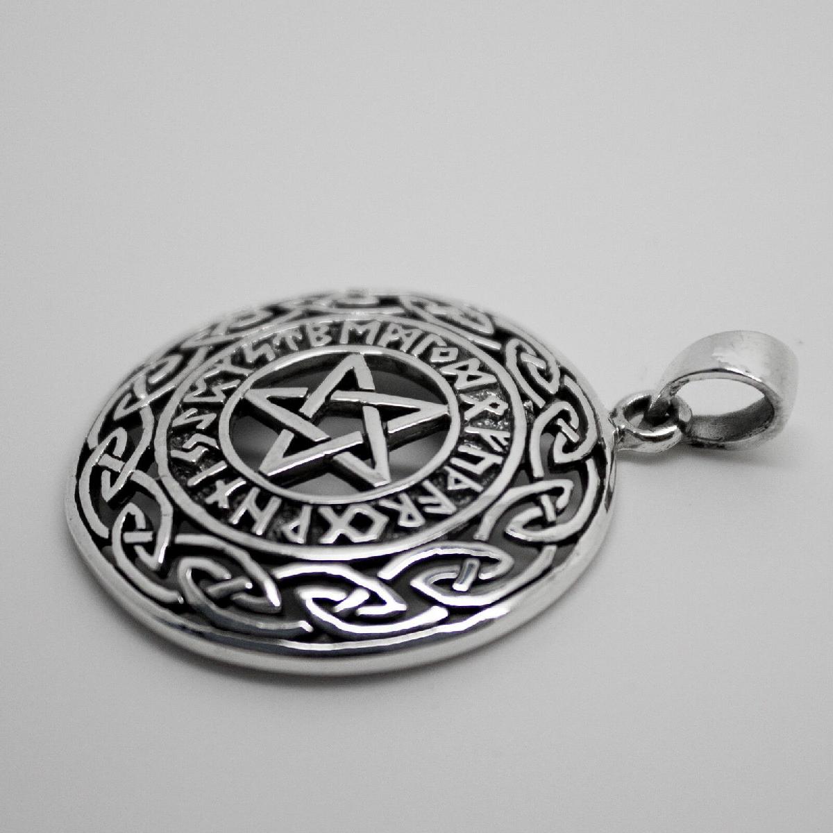 925 SOLID STERLING SILVER PENTAGRAM PENTACLE WITH CELTIC CROWN AND RUNES PENDANT [ENDED]