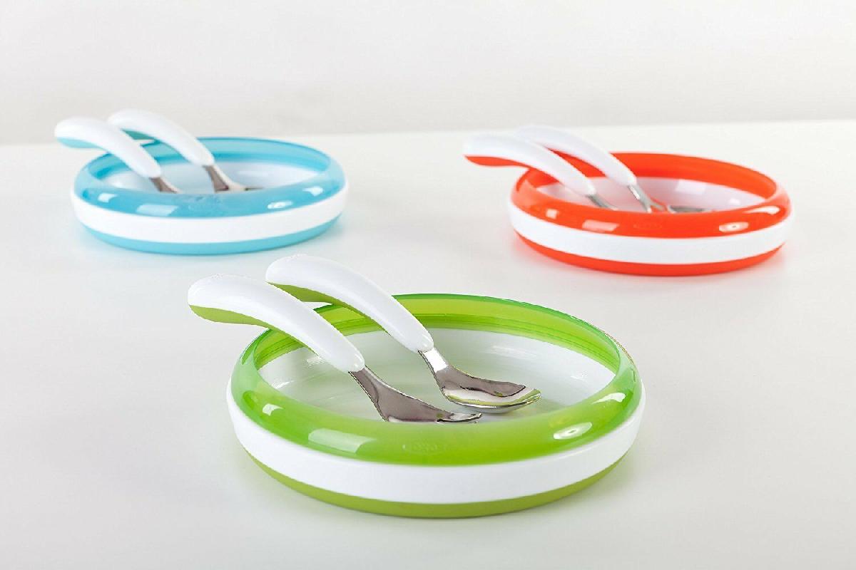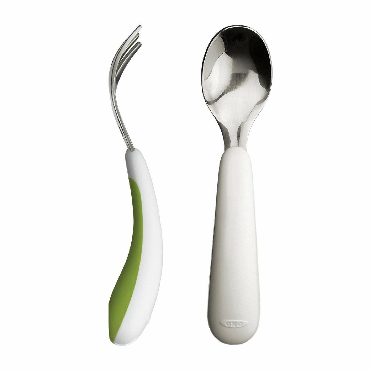 3 X OXO TOT FORK AND SPOON SET GREEN SOFT CURVED NON SLIP GRIP DISHWASHER SAFE [ENDED]