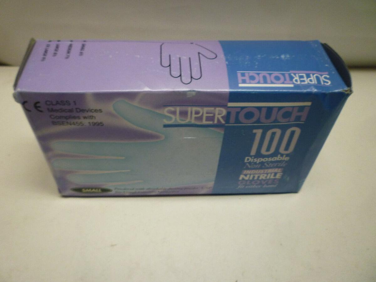 100 DISPOSABLE POWDED GLOVES BLUE SUPERTOUCH - (1 FULL BOX OF 100) NEW. S [ENDED]