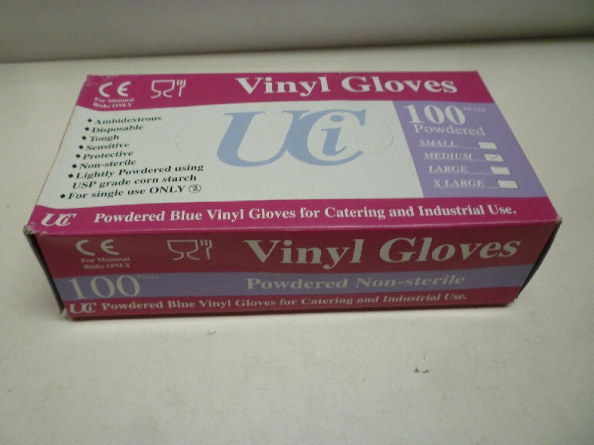 100 DISPOSABLE POWDED VINYL GLOVES BLUE UCI - 1 FULL BOX OF 100 - NEW - MEDIUM [ENDED]