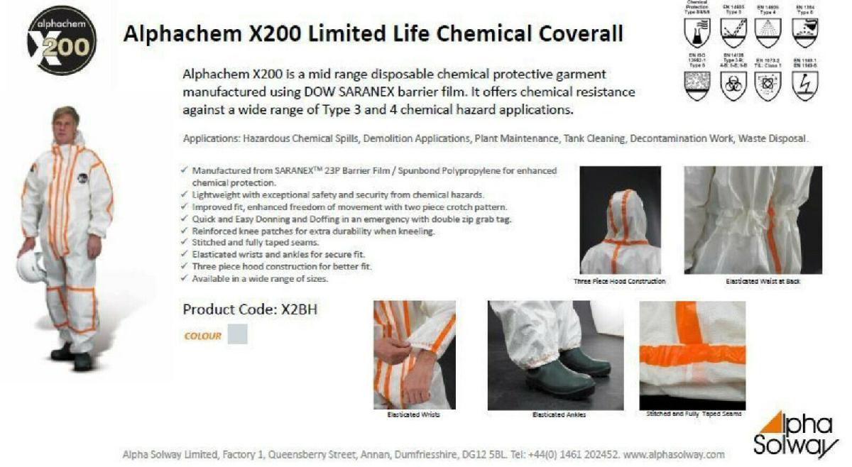 ALPHA SOLWAY ALPHACHEM X200 DISPOSABLE COVERALLS CHEMICAL RESISTANT OVERALL 3XL [ENDED]