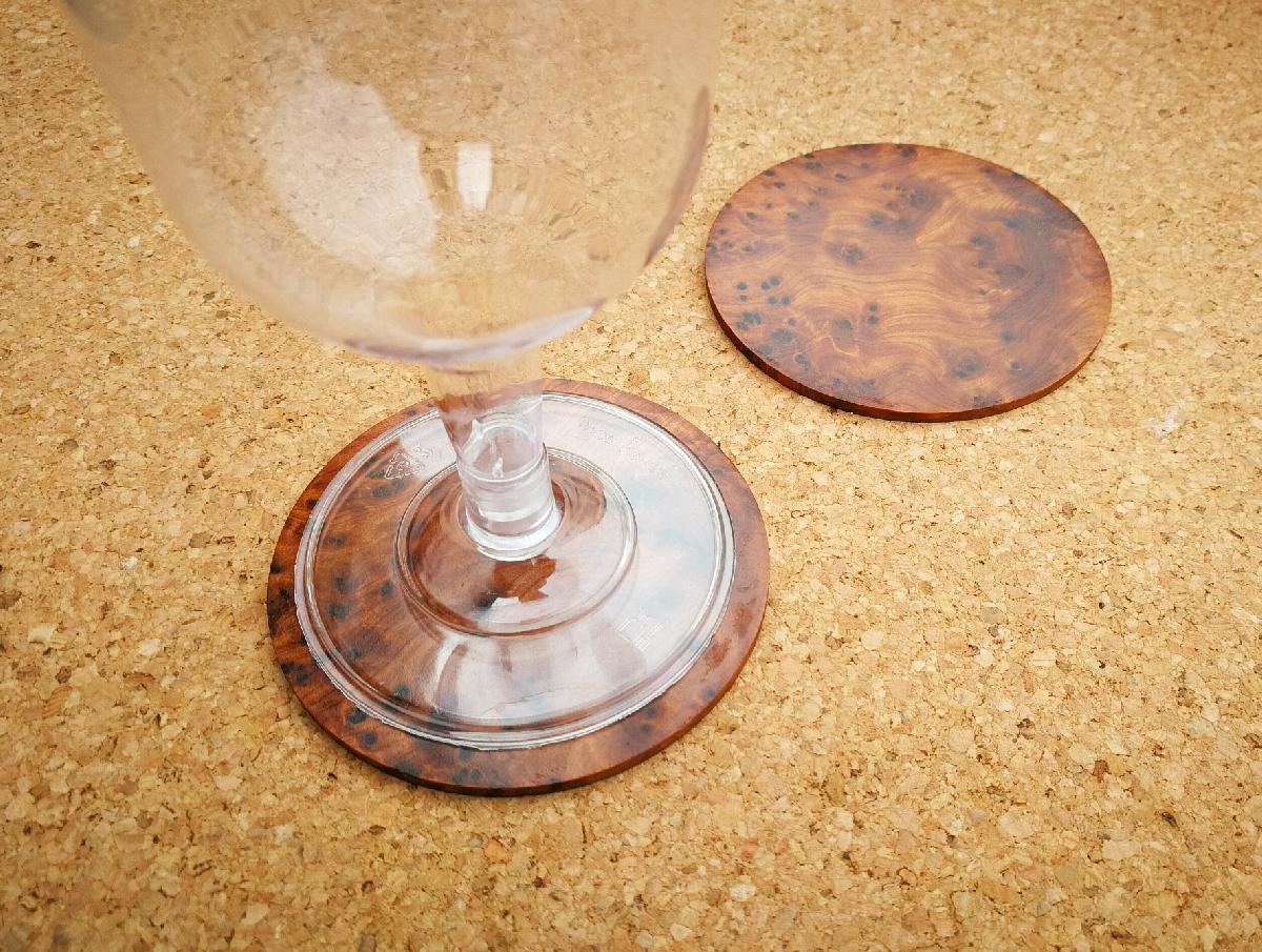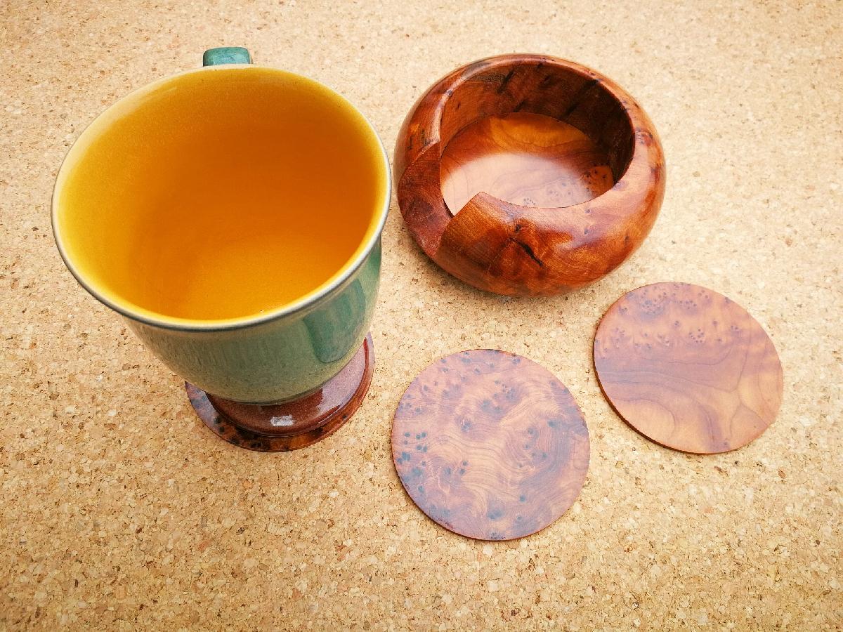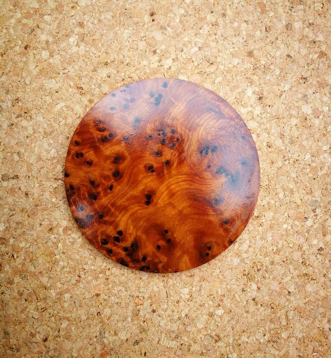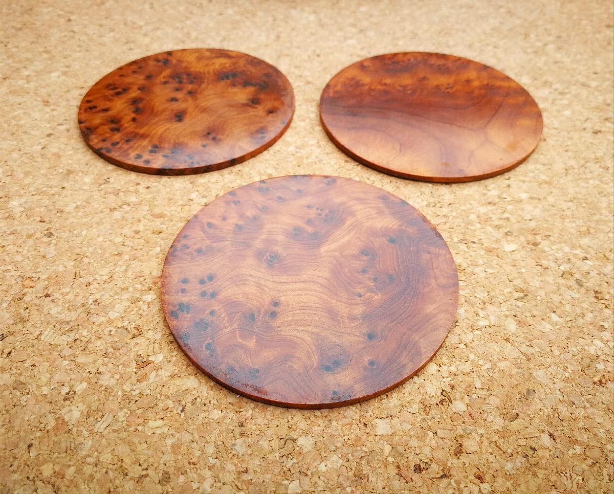 THUYA WOOD ROUND COASTERS & HOLDER SET NATURAL GRAIN / BURR HAND-CARVED MOROCCO [ENDED]