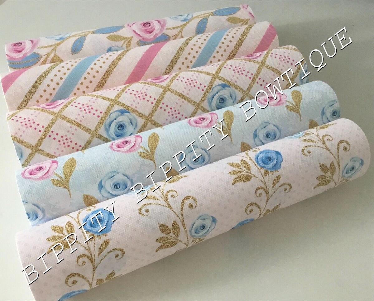 SPECIAL OFFER PACK OF 5 PINK/BLUE ROSES CANVAS PRINTED FABRIC SHEET.HAIR BOWS [ENDED]