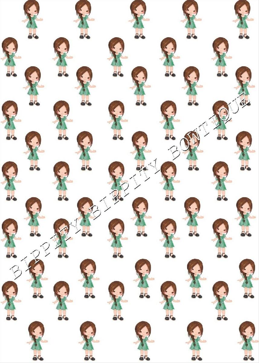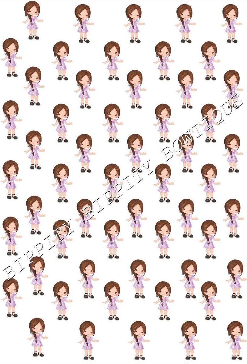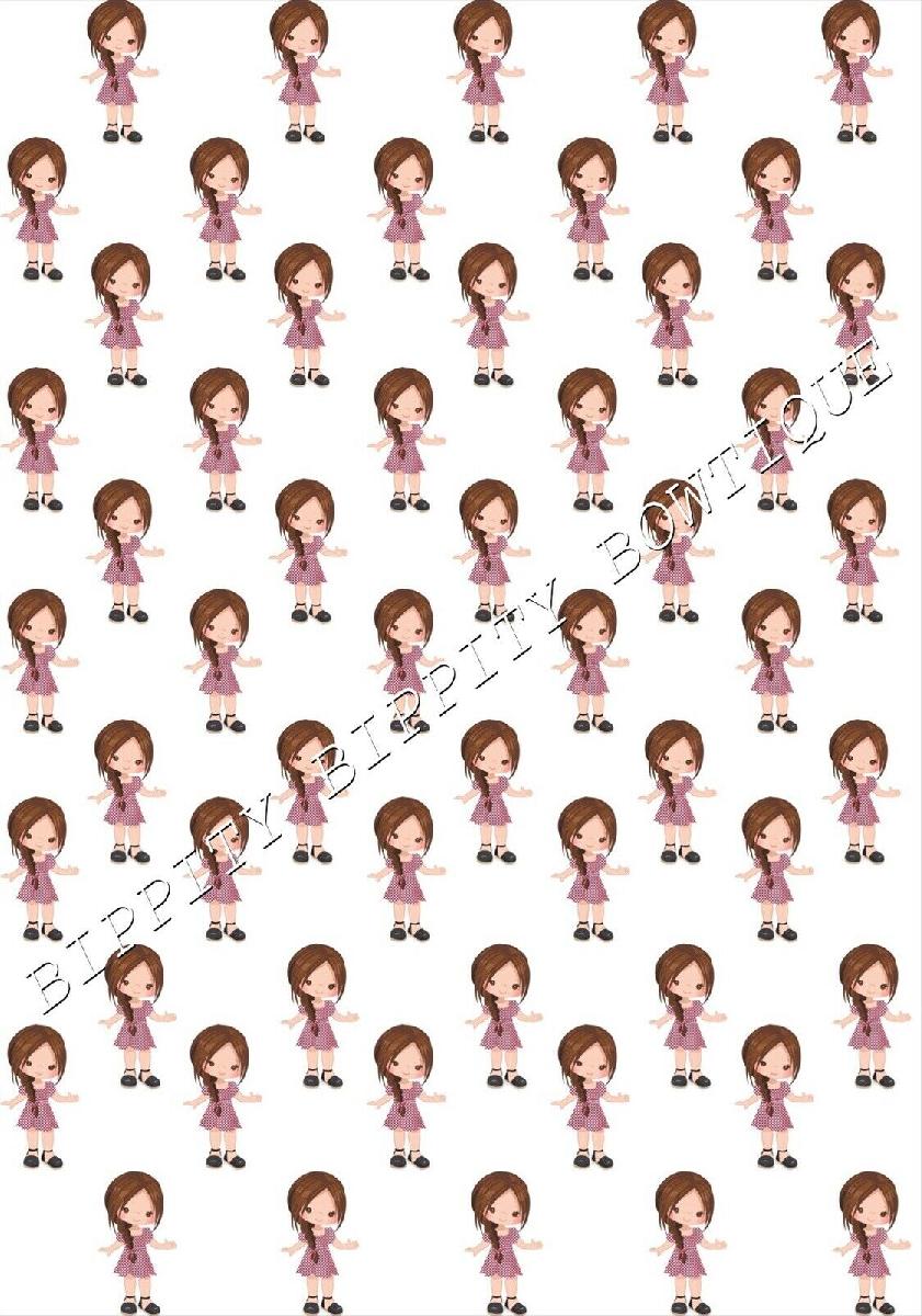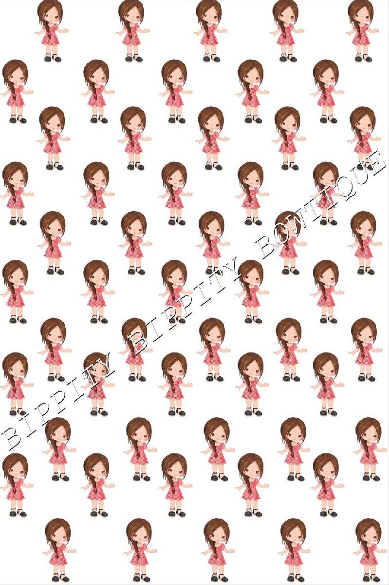 "SCHOOL GIRLS GINGHAM DRESS" BROWN HAIR CANVAS FABRIC SHEET.. BOWS, EXCLUSIVE [ENDED]