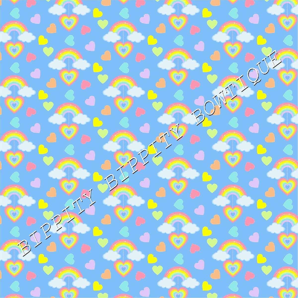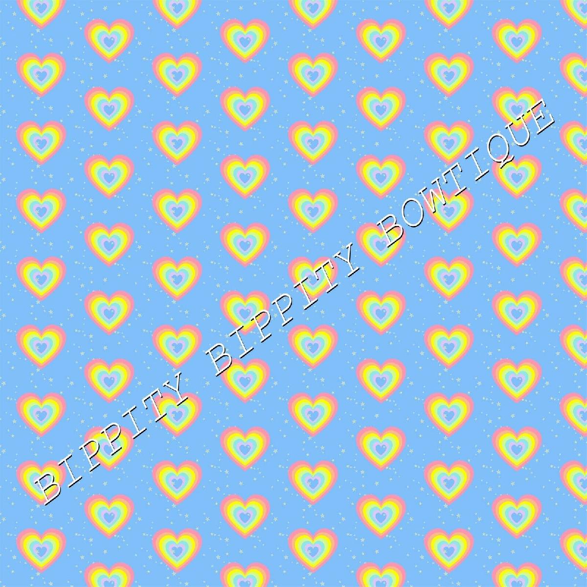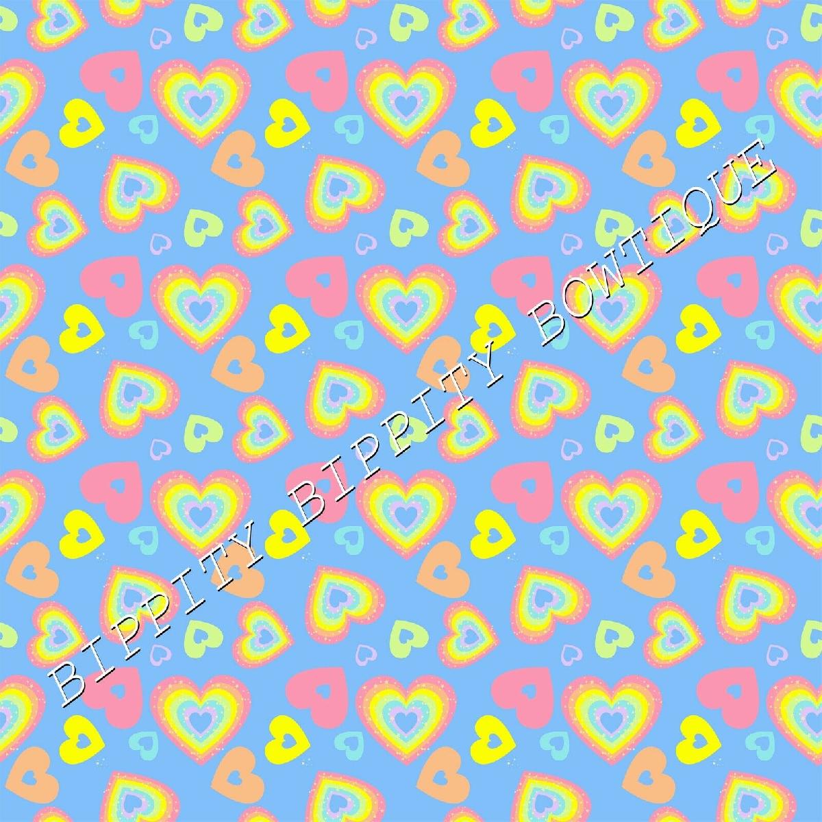 GORGEOUS "MAGICAL RAINBOW HEARTS" PASTEL CANVAS PRINTED FABRIC .HAIR BOWS, [ENDED]