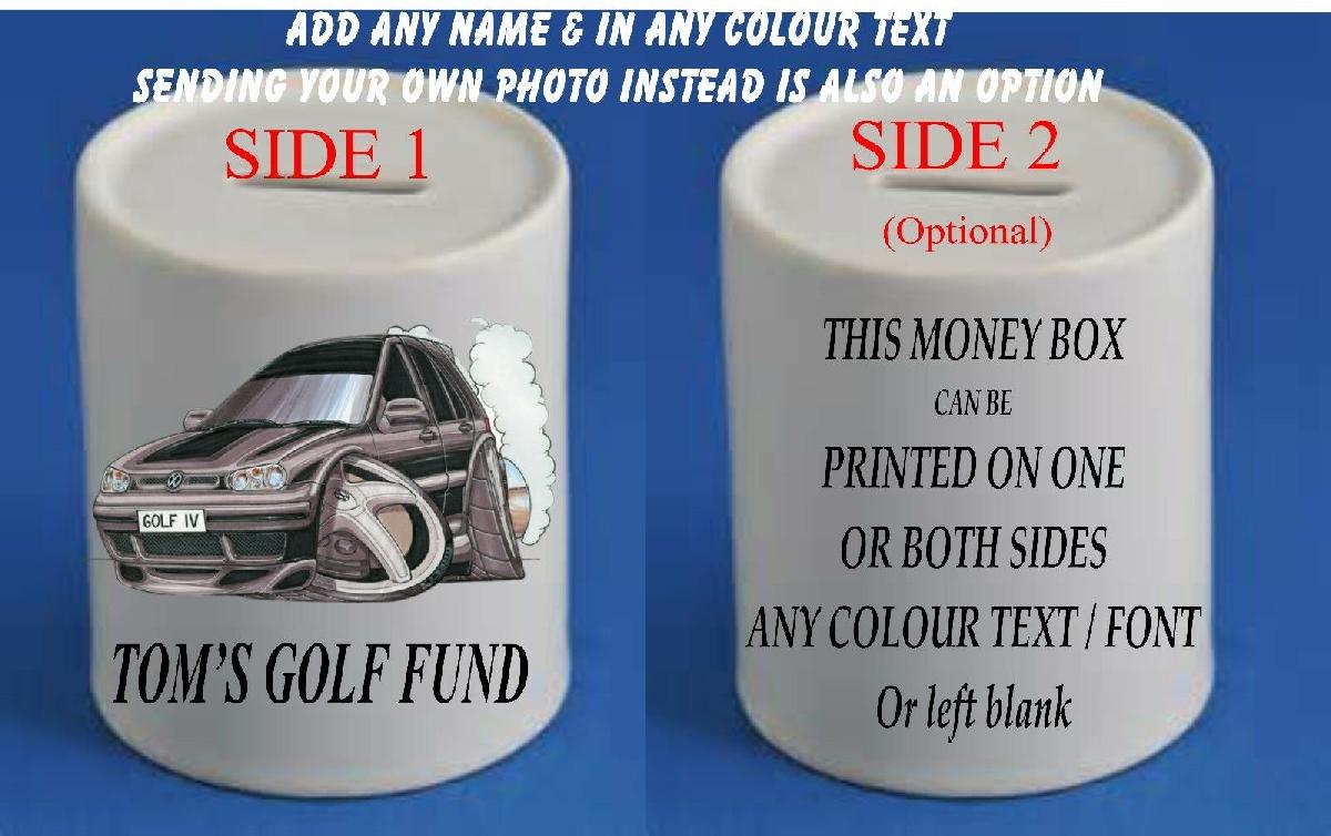 VW GOLF PERSONALISED MONEY BOX MODELS CAR KOOLART GIFT CUP VEHICLE [ENDED]