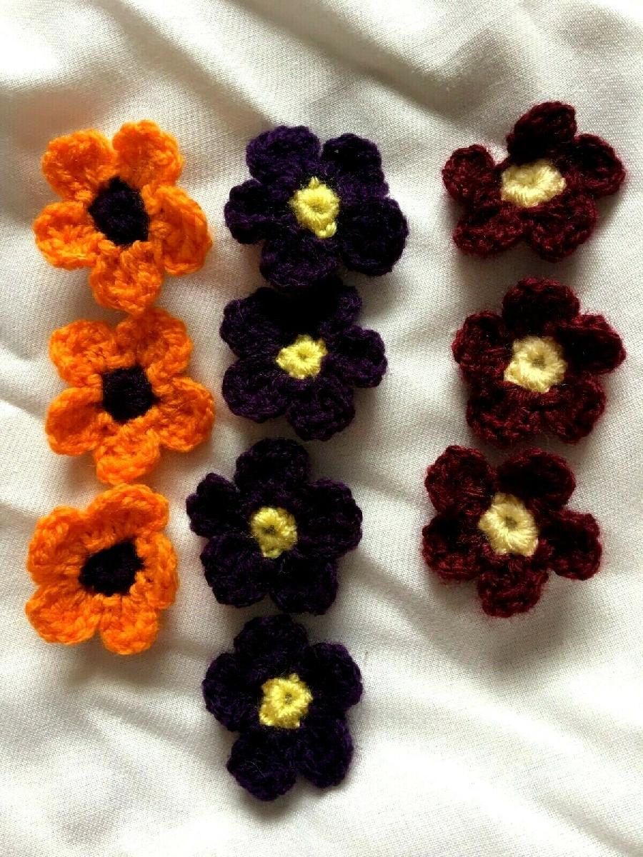 HANDMADE CROCHETED LITTLE FLOWERS ACRYLIC BURGUNDY ORANGE PURPL 3 CM PACK OFF 10