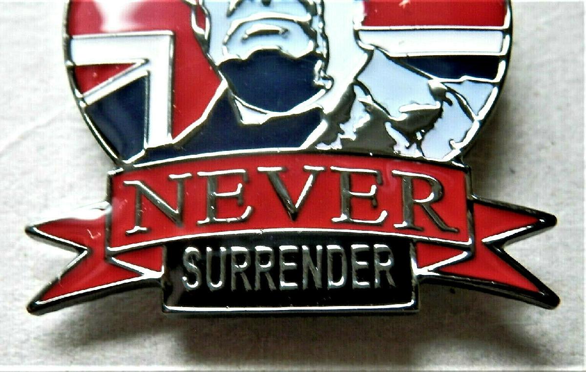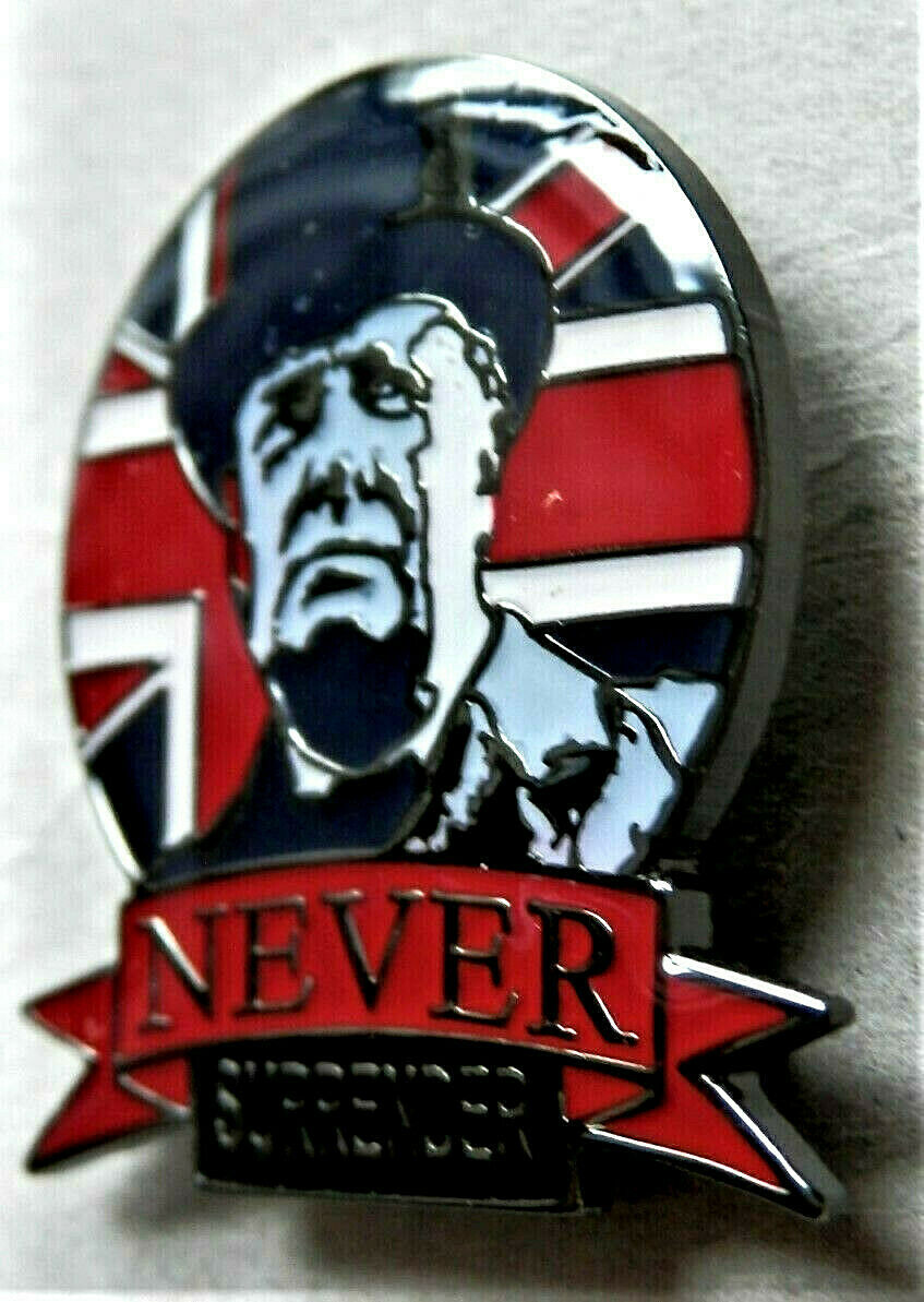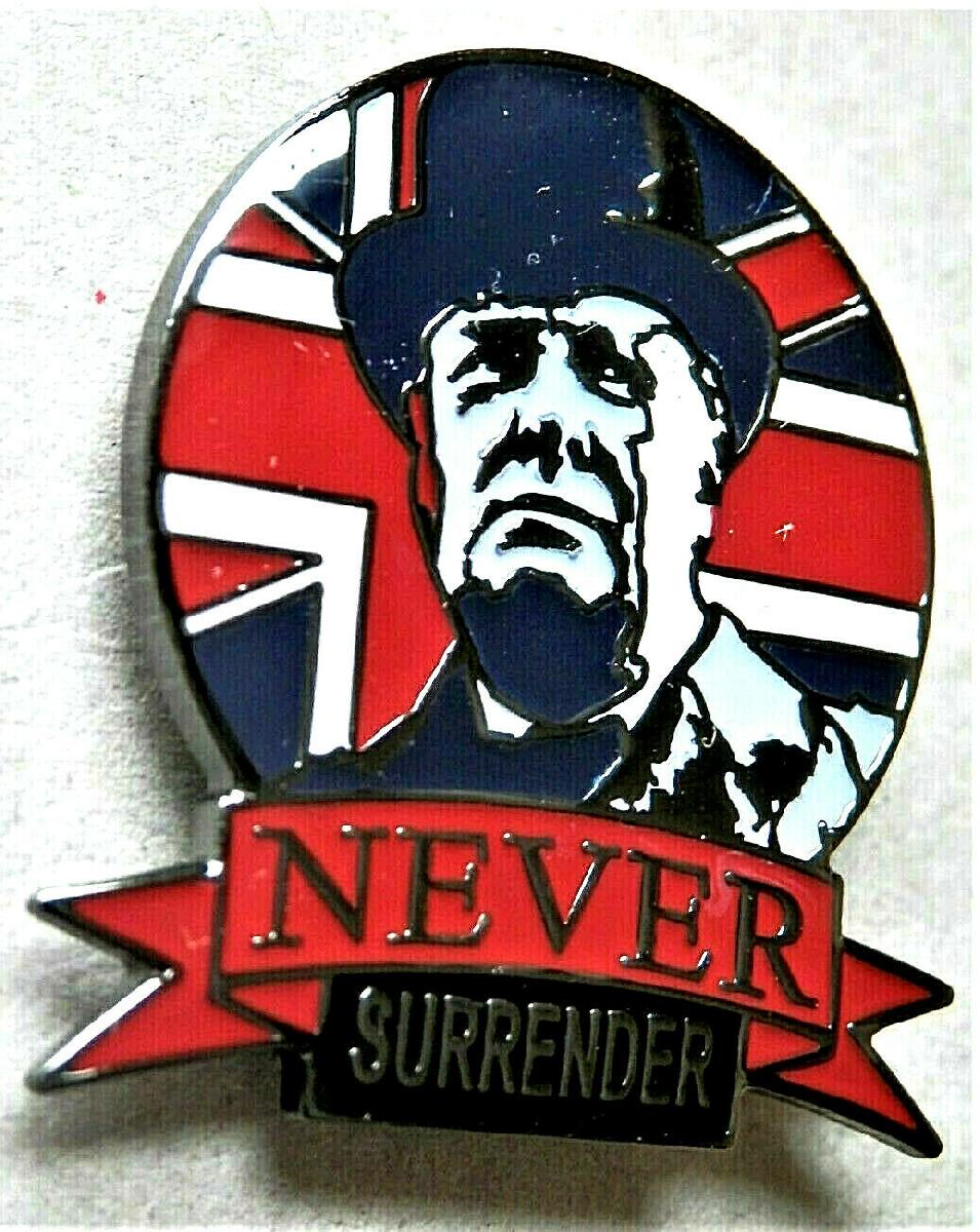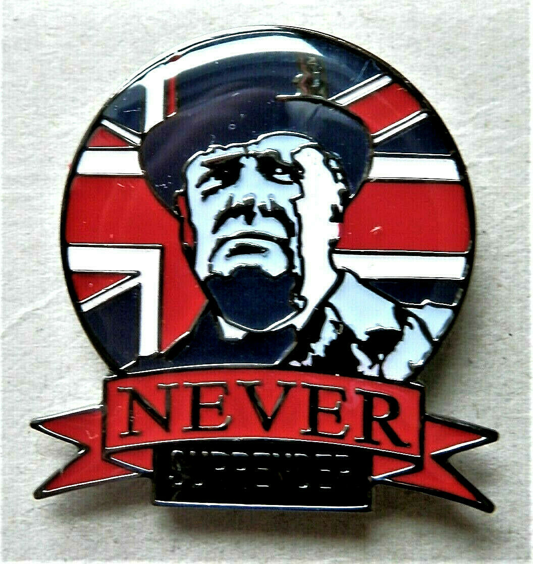 WW2 NEVER SURRENDER WINSTON CHURCHILL BRITISH ENAMEL PIN BADGE UNION JACK [ENDED]