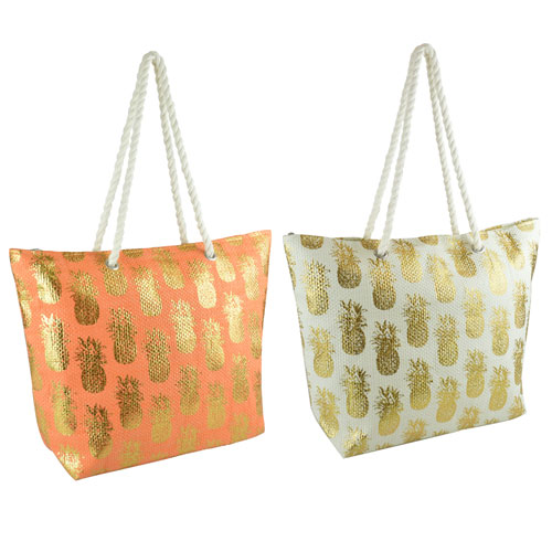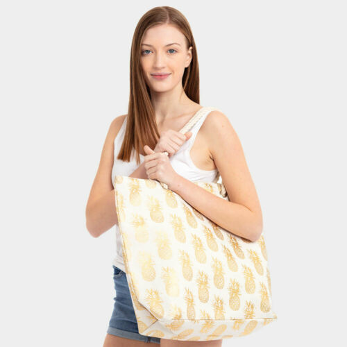 NEW WHITE CANVAS GOLD FOIL PINEAPPLE FRUIT PRINT PURSE TOTE TRAVEL SHOPPING BAG [ENDED]