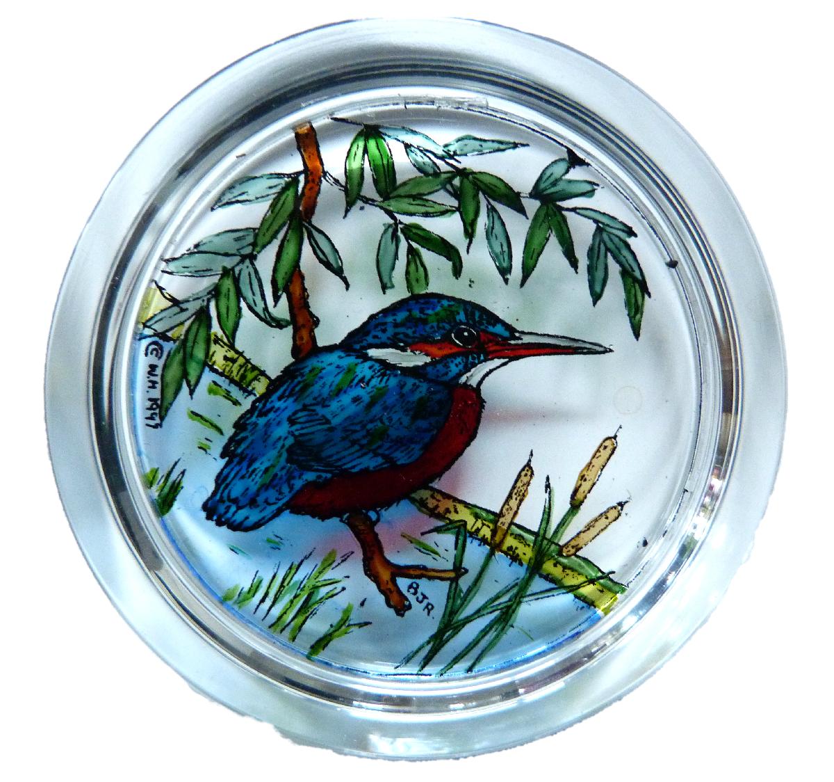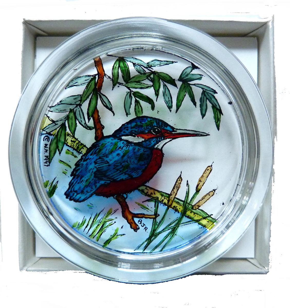DECORATIVE HAND PAINTED STAINED GLASS PAPERWEIGHT KINGFISHER DESIGN [ENDED]