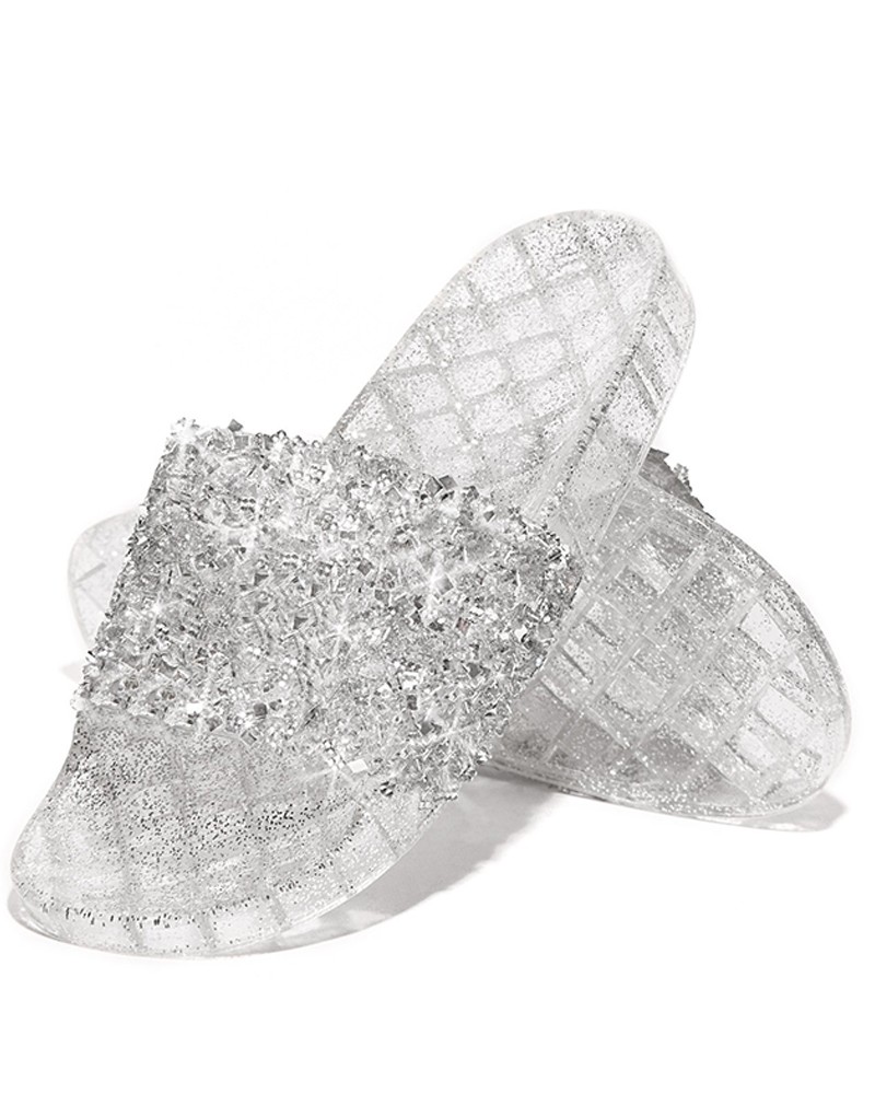 OPEN TOE SIZE 5 SILVER GLITTER STUDDED FLAT SANDALS / SLIDERS WITH NEXT DAY DELIVERY [ENDED]