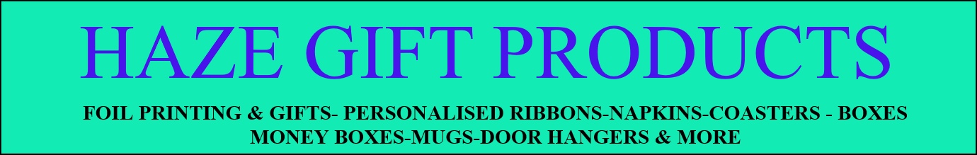 Haze Gift Products sell various Personalised Gifts, Ribbons,Foil Printing, Vinyl lettering and decals.. Ideal for events, Weddings, Birthday, Anniversaries,Funeral, Memorials and others. Includes personalised mugs, moneyboxes, napkins,boxes, doorhangers, small vinyl signs, ribbons for all occasions.